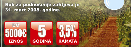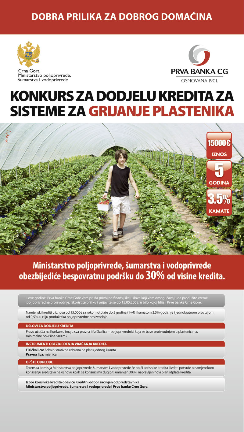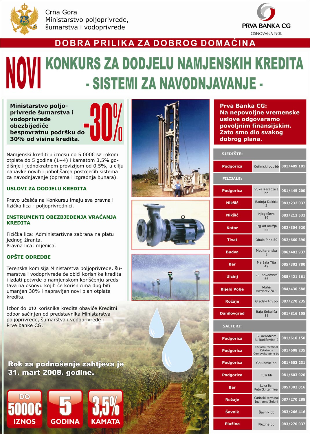 Ministarstvo poljoprivrede, šumarstva i vodoprivrede i Prva banka Crne Gore, su raspisali novi konkurs za dodjelu namjenskih kredita za sisteme za navodnjavanje. Rok za podnošenje zahtjeva je 31. mart 2008. godine.
